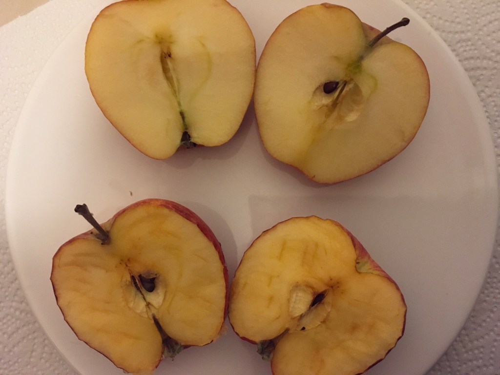 During the apple experiment students said kind words to one apple and nasty words to another apple. Then I cut the apples in half and showed the students their interior. The apple that had heard the kind words was healthy inside, but the one that heard the nasty words was bruised. This result surprised the students and led some of them to say sorry to the bruised apple. The activity took about 10 minutes.