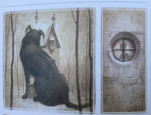 I (me! Sandie!) have finally managed to disentangle my thoughts about ‘Black Dog’ by Levi Pinfold (Templar Publishing, 2011), which won the Kate Greenaway award in 2013. In Levi Pinfold’s story, the Hope family, who live in an isolated forest, are visited one winter day by a mysterious black dog. As each member of the family (Mr Hope, Mrs Hope, Adeline Hope and Maurice Hope) spots the dog through the windows of their house, they get more and more terrified. As their fear grows, the dog does too, until it reaches a gigantic size. But, of course, it is the youngest member of the Hope family, ‘Small’, who is totally fearless and who steps heroically out of the house to confront the enormous dog and show her family that ‘there’s nothing to be scared of’. It is hailed as the perfect book for ‘confronting your fears’.