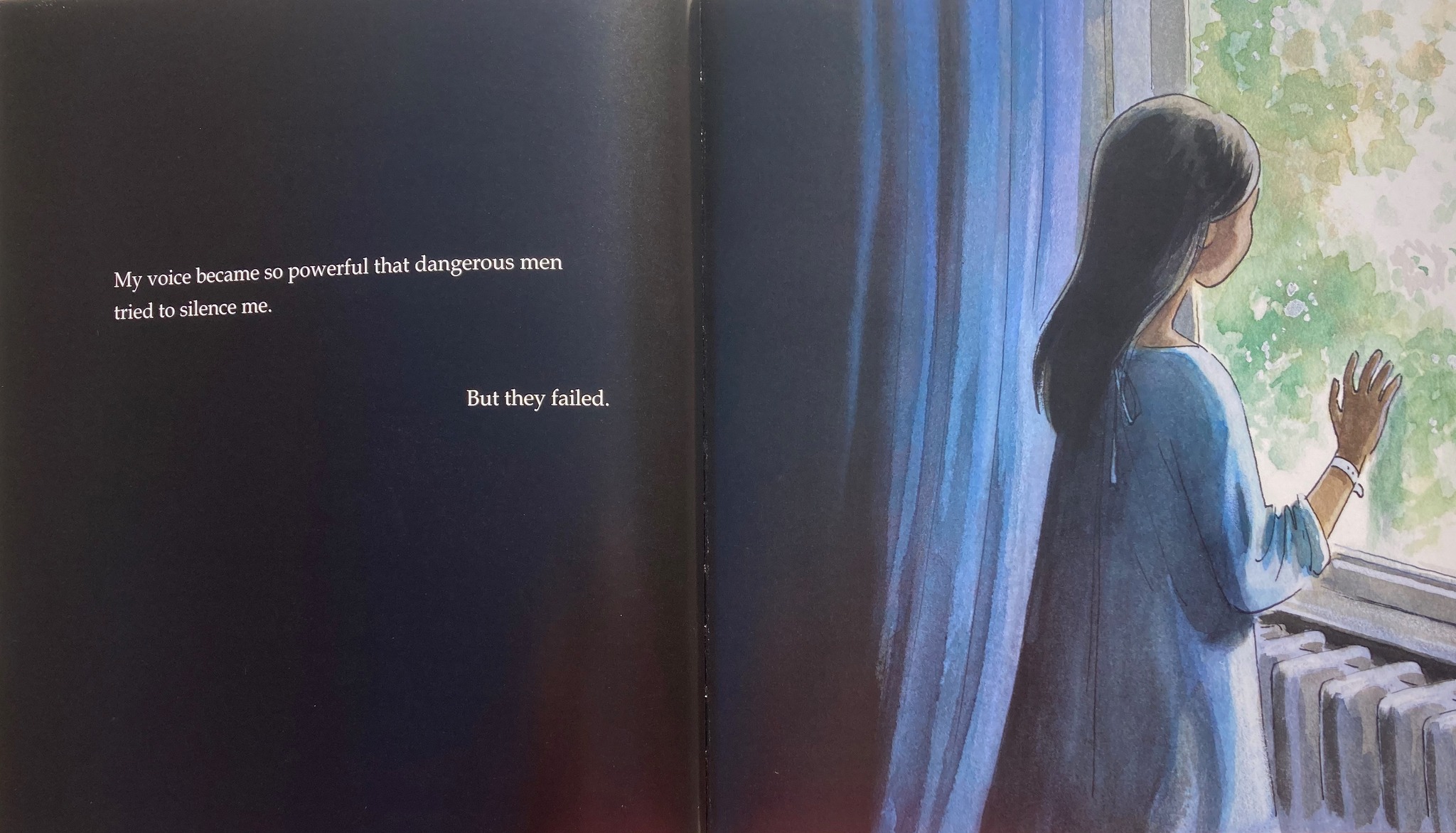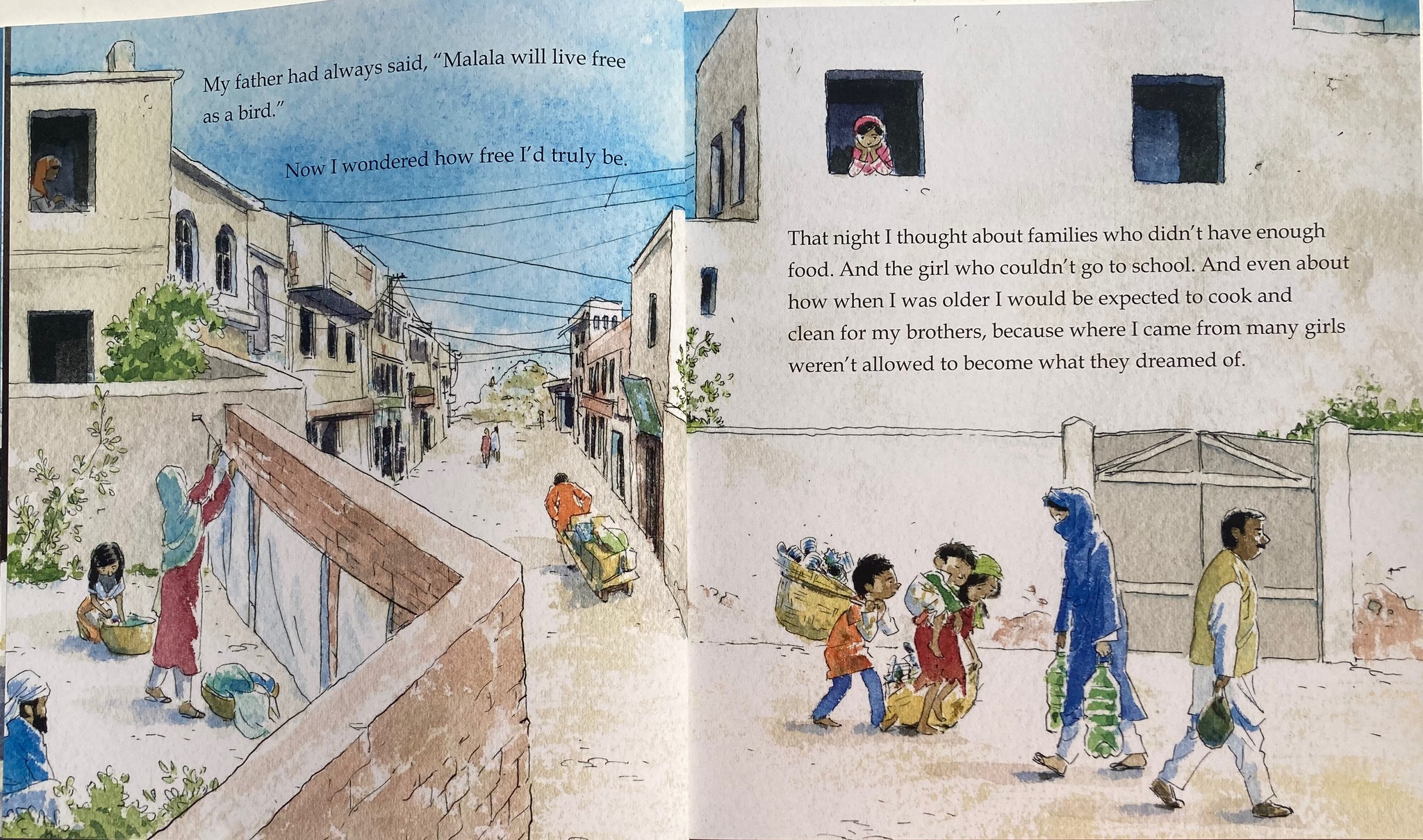Kerascoët’s illustrations are life-like representations of Malala’s world. We see and feel her emotions and what has prompted them, as the images not only support and synchronise what Malala’s words tell us, but expand on what she says to bring the reader into the tale. For example, the life-threatening attack is depicted across a double spread – an opening which is in full bleed, moving from black to dark, grey-blue, becoming the curtains at a window, which Malala is looking through. The attack requires some mediation here, a careful pause and some explanation maybe, with a question to prompt reflection on the impact such an attack might have had on Malala, but also on those who knew about her work.