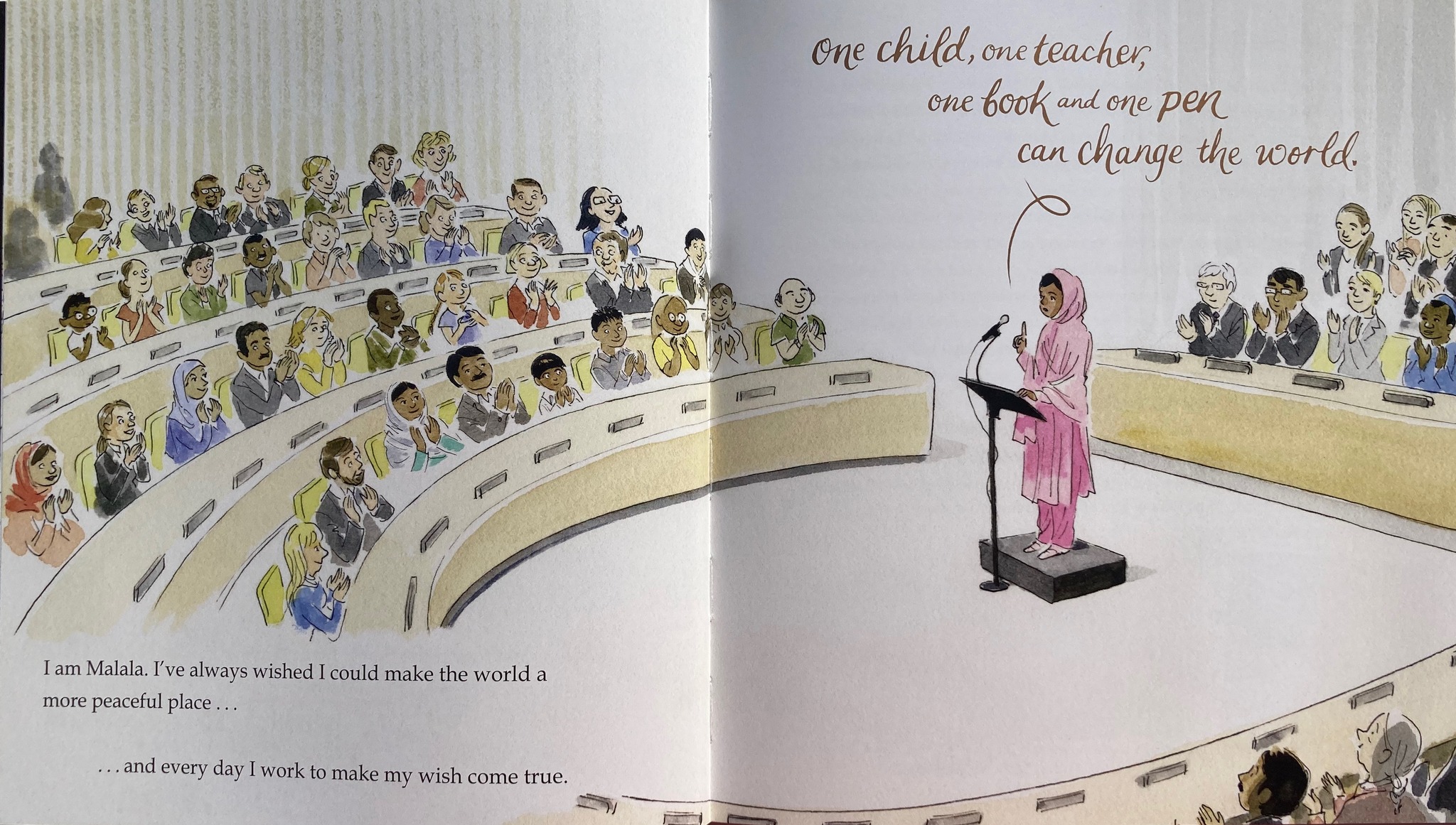 The tale ends with Malala speaking at the United Nations. The double spread shows us that everyone is clapping, her family is there too. “… and every day I work to make my wish come true.” On the recto page she stands upright dressed in prink, with her finger raised, and the gold arabesque writing shows us what she says: One child, one teacher, one book and one pen can change the world.