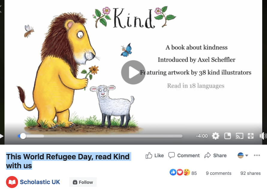 “Imagine a world where everyone is kind. How can we make that come true? See the story of Kind read in 18 languages for #WorldRefugeeDay in support of refugee charity Three Peas.” Scholastic UK. Kind was our picturebook of the month for October 2019. You can find all our videos here: